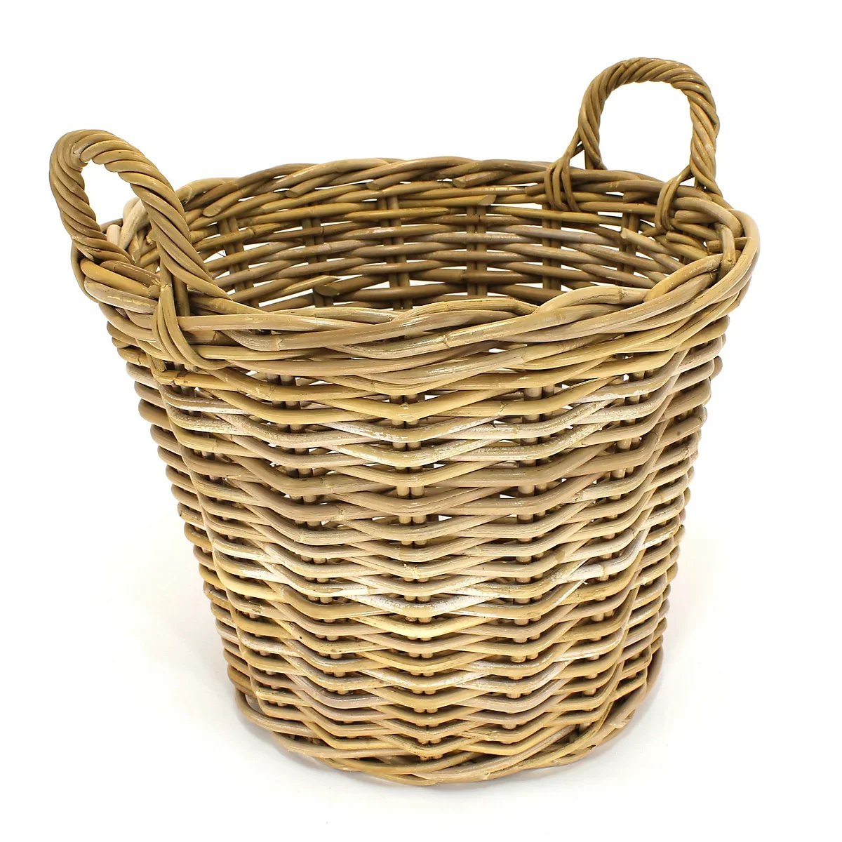Chestnut finish, round, wicker baskets, lined with soft hessian. Perfect for holding plants, trees, blankets, or dΓ©cor. Small: 33 cm diameter. Medium: 42cm diameter. Large 51cm diameter.